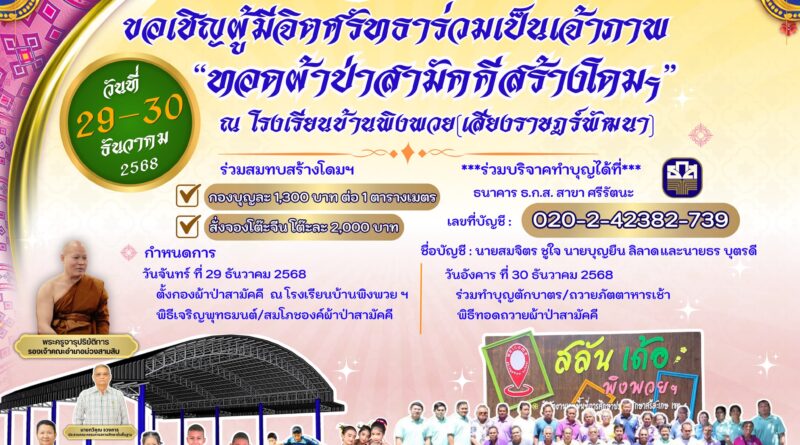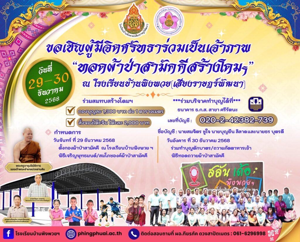 กิจกรรมโรงเรียน ขอเชิญผู้มีจิตศรัทธาร่วมเป็นเจ้าภาพ “ทอดผ้าป่าสามัคคีสร้างโดมฯ” วันที่ 29-30 ธันวาคม 2568 November 3, 2025 pumin sangsamrit